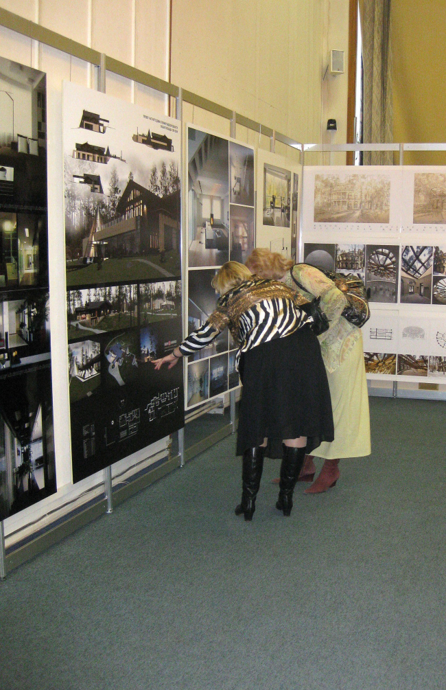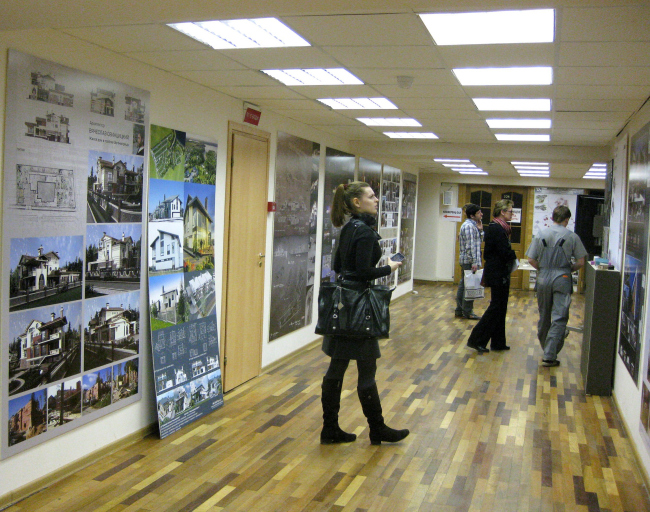 Пространство «Под крышей дома» традиционно делится на две совершенно разные части – в конференц-зале выставляются проекты и реализации участников фестиваля, а по периметру зала генерального плана Москвы, вокруг знаменитого макета, размещаются специальные и коммерческие экспозиции. Своеобразным связующим звеном между ними можно считать коридор – из-за необходимости выгородить в конференц-зале место для проведения дискуссий часть планшетов неизбежно «выплескивается» за его пределы, так что дорога к «12 стульям» в этом году была вымощена архитектурой.