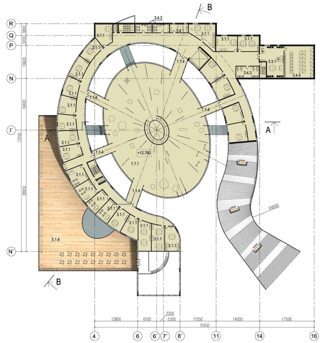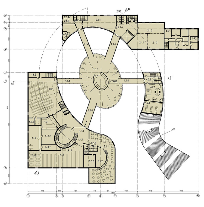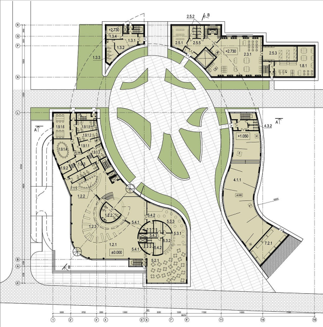 Корпуса В и С, в которых расположены все необходимые дополнительные функции, представляют собой узкие сблокированные параллелепипеды, стены которых так же «расщеплены» треугольными прозрачными вставками. По сути, это задний фасад комплекса, та заслонка, которая надежно фиксирует эфемерный сфероид в створе дугообразных зданий.  Архитекторы досконально продумали связи корпусов с основным выставочным пространством: свои галереи-переходы имеют и детский центр (преподаватели смогут проводить небольшие экскурсии и обучающие лекции), и творческие студии. Помещения детского центра организованы таким образом, чтобы иметь еще и непосредственный выход в парк, а в корпусе С, где располагается архитектурный центр, последний этаж отведен под кладовые и зону неформального общения.