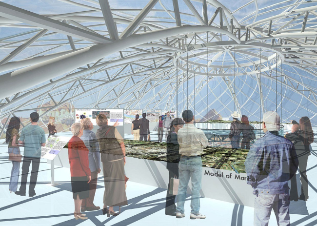 Имеющийся квартал коллектив Владимира Биндемана разделил по диагонали и на этой условной прямой, соединившей перекресток улиц Ribiška, Koroška Cesta и перекресток улиц Pristaniška и Vojašniška, разместил основное экспозиционное пространство. Оно заключено в прозрачный сферический объем, эдакий дирижабль, окруженный вспомогательными помещениями. Эти помещения объединены в два корпуса, которые к улицам обращены традиционными прямоугольными объемами, а к сфероиду – плавными изгибами, в плане напоминающими кисти рук, словно бережно поддерживающими хрупкую субстанцию. С выставочным пространством «руки» соединены переходами на различных этажах, так что связь всех помещений комплекса осуществляется через это центральное прозрачное ядро. Кровля правой «руки» представляет собой гигантский пешеходный пандус, левый же корпус имеет плоскую неэксплуатируемую крышу, на которой размещены устройства для сбора дождевой воды и солнечные батареи, аккумулирующие энергию для нужд здания. В облицовке самого сфероида архитекторы предлагали использовать специальное матовое покрытие из энергосберегающего стекла с функцией затемнения, которое позволило бы уберечь произведения искусства от слишком интенсивного солнечного света.