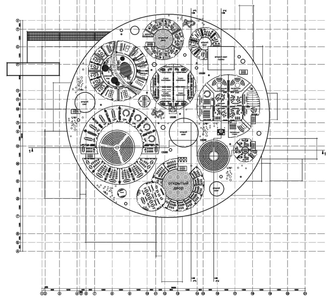 Конечно, многочисленные круги, использованные в композиции этого комплекса, будь то гигантский диск кровли или вырезанные в нем световые отверстия, и их сочетание со строгим геометризмом основных объемов, не могут не напоминать об эстетике супрематизма. Но в проекте Дворца творчества школьников архитекторам «Студии 44» удалось не просто переосмыслить идеи русского авангарда, но и органично увязать их с казахскими культурными и домостроительными традициями. И если орнаментация фасадов и ромбовидный рисунок жалюзи, напоминающий решетчатую структуру кереге – сборно-разборных стен юрты – это очевидные и сразу считываемые аллюзии, то глубинные параллели, затрагивающие сокровенную область планировки и восприятия пространства, превращают этот современный комплекс в увлекательную головоломку со множеством смыслов.