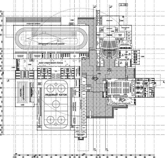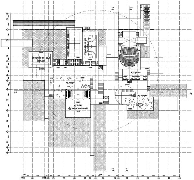 Как уже говорилось, архитекторам пришлось немало поломать голову над тем, как уместить под одной кровлей более десяти различных функций. Фактически под круглым кровом расположены четыре разных комплекса – спортивный, театрально-зрелищный и музейно-выставочный, а также офисы администрации, библиотека и обеденный зал. Функциональные группы разобраны на составляющие их «первоэлементы» (каток, музей, бассейн, выставочный зал и т.д.), каждый из которых упакован в свой собственный объем. Разные по площади, они имеют одинаковую форму параллелепипеда, и, будучи покрытыми орнаментами, напоминают казахские войлочные чемоданы (шабаданы). И как в кочевой традиции шабаданы внутри юрты составлялись один на другой, так и эти объемы образуют четыре уступчатых «горы». Две из них расположены слева от главного входа во Дворец и вмещают залы спортивного комплекса. Справа же от главного входа, по традиции обращенного на восток, находятся музейно-выставочный комплекс и столовая. На самом почетном месте – в глубине здания напротив входа – помещен театр. Прямоугольные объемы первых трех этажей здания то приближаются к красным линиям квартала застройки, местами консольно нависая над ними, то отступают вглубь, образуя уютные курдонеры. Подобный прием «сборки» комплекса из отдельных элементов зрительно скрадывает его истинные габариты, а уличному фронту придает динамику и живописность. А укрывающий здание диск сплачивает конгломераты из прямоугольных блоков воедино и подхватывает линию горизонта окружающей застройки.