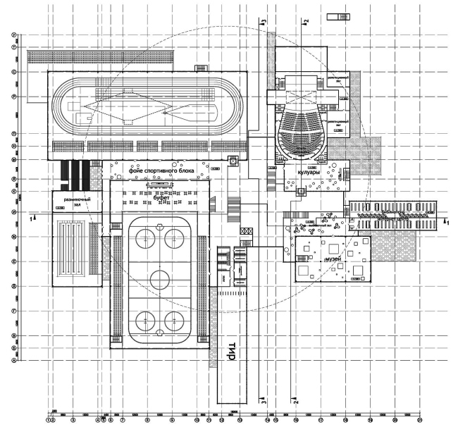 В гигантскую площадку для игр и занятий на свежем воздухе превращается и эксплуатируемая кровля комплекса. Ее плоскость, как уже говорилось выше, полностью озеленяется, и над образующимся гигантским газоном возвышаются лишь купола планетария и зимнего сада, а также несколько зенитных фонарей и башня обсерватории. Пожалуй, больше всего эта картина напоминает о степных пейзажах, которые теперь, правда, окажутся не за пределами каменных джунглей, а внутри них и одновременно – над ними.