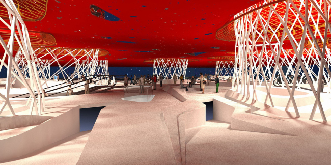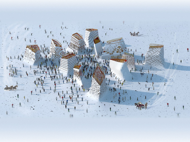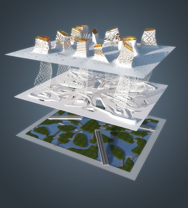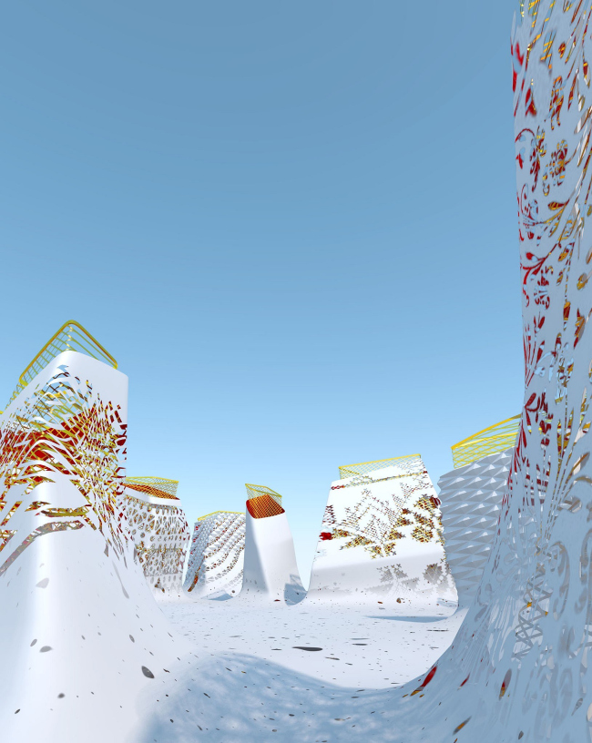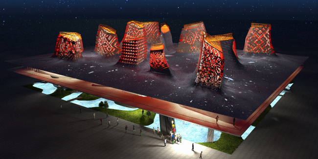 Нужно сказать, придуманный TOTEMENT/PAPER павильон изначально представлял собой ансамбль из более чем десяти башен, однако их роль в общей композиции сооружения за прошедшие с момента конкурса два года менялась не раз. В частности, изначально архитекторы трактовали экспозицию как трехчастное пространство, состоящее из парка на уровне земли, общей для всех доминант кровли и пустоты между ними. Основания башен были облицованы деревом и зарывались в почву, символизируя корни великой державы, верхняя платформа объединяла их завершения и являла собой торжество современных конструкций и технологий, а свободное пространство между зеленым полом и потолком, окруженное со всех сторон башнями, и становилось тем городом в миниатюре, в котором проживает современный человек. Эта концепция не только хорошо отвечала девизу «ЭКСПО-2010» «Лучше город – лучше жизнь», но и отражала ключевые для обеих культур архетипы о мироустройстве: китайская триада Земля, Человек, Небо – «Тайцзи» – совпала с представлениями древних руссов о Матери-Земле и Отце-Небе, которые и создали в пустоте между собой все сущее. Отсылал российский павильон и к образу огромной, бескрайней страны, на территории которой живет множество народов, бережно сохраняющих свои традиции, – каждая из башен была украшена национальным декором. Проект TOTEMENT/PAPER привлек жюри лаконизмом и при этом многозначностью композиции, однако у экспертов возникли вопросы, насколько реализуема предложенная архитекторами конструкция. Так у проекта появился консультант – всемирно известное инженерное бюро ARUP, подтвердившее его «состоятельность».
