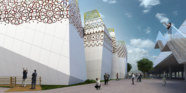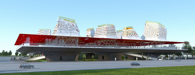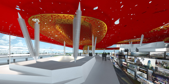 Трехчастность, таким образом, осталась основой композиционного решения Российского павильона. Он состоит из трех основных элементов: блока из двенадцати L-образных бело-золотых башен, куба, имеющего габариты 50х50 метров, и внутренней инсталляции «цветочный город», посвященной взгляду детей на будущее современных городов. Башни выстроены по периметру участка таким образом, что все буквы L своими «ножками» обращены к его центру – на их основаниях и лежит объем основного экспозиционного зала. План павильона сами архитекторы сравнивают с солнцем и корнями «Мирового дерева» древних славян, на ветвях которого покоятся небеса жизни. Башни же, имеющие ультрасовременные ломаные формы и бело-красно-золотой декор, с одной стороны, отсылают к историческим образам русской архитектуры (завершение одной из них недвусмысленно напоминает купола Собора Василия Блаженного), а с другой символизируют быстрорастущие современные мегаполисы с их небоскребами нелинейной архитектуры. Самым же главным элементом «настоящего» в павильоне, пожалуй, следует считать природный парк с лужайками и водоемами – какой бы ни была цивилизация, она возможна лишь в гармоничном союзе с природой, и этот союз архитекторам удалось продемонстрировать.