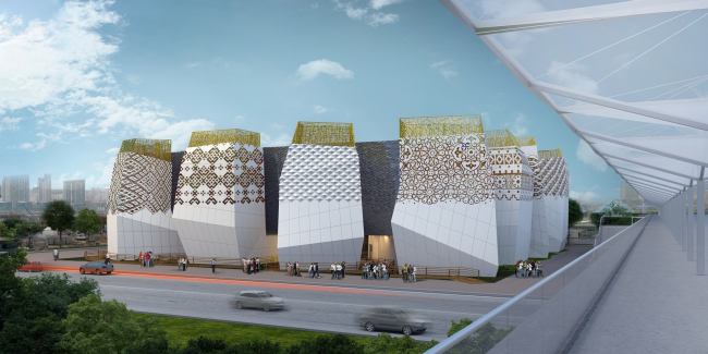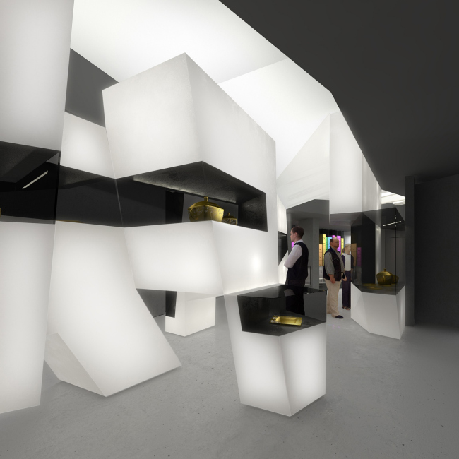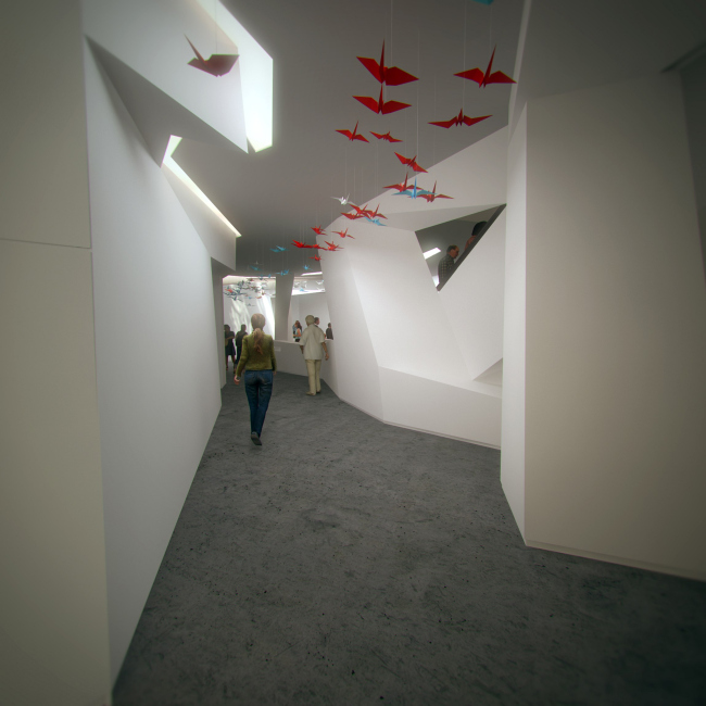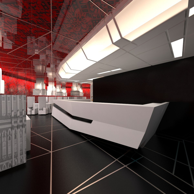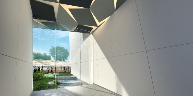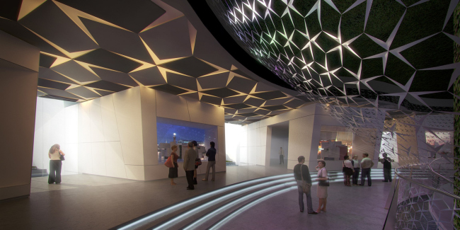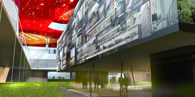 Когда архитекторы начали работать со сценографами, между двумя платформами появился кубический объем площадью 1000 квадратных метров с залами для экспозиций. Вся его передняя плоскость была разбита на 1103 части – по количеству городов России, причем каждому городу отдана площадь в зависимости от количества жителей. Каждая из площадей превращалась в экран, на который должен был проецироваться фильм о городе, и фасады куба таким образом становились гигантским зеркалом, отражающим «Настоящее» России. Позже эта идея, к сожалению, была признана слишком затратной и сложной, но метафора о фасаде как зеркале в проекте уцелела – объем основного экспозиционного зала снаружи облицован пластиковыми панелями с зеркальным эффектом. Тонкие и подвижные, они колышутся при каждом дуновении ветра и делают куб, притаившийся в объятиях двенадцати башен, похожим на живое и хрупкое существо.