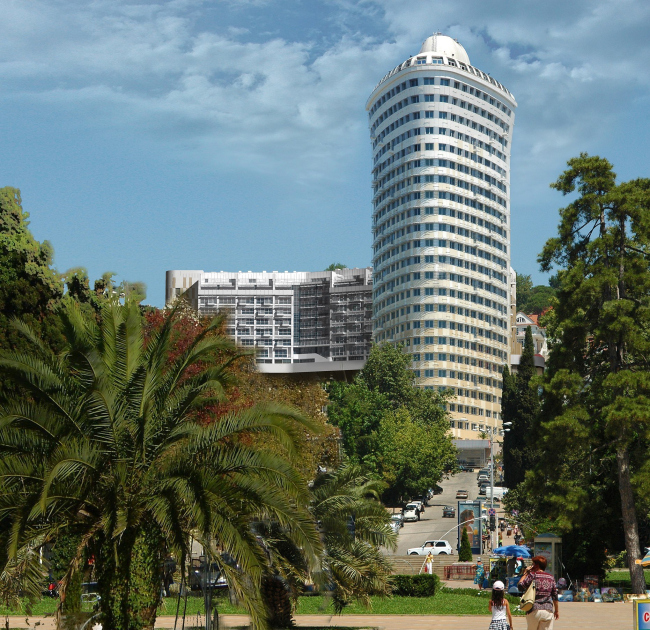 Невысокий протяженный дом – вторая очередь башни «Титаника», о котором мы писали три года назад и строительство которого уже закончено. Напомним, обтекаемый силуэт 24-этажного жилого дома отчетливо напоминает нос океанского (судя по размерам) лайнера – во всяком случае, эффект оно производит примерно такой же, как и настоящий лайнер, показавшийся с туристами на борту где-нибудь в Венеции в районе Джардини. Впрочем, в отличие от корабля дом облицован панелями цвета окрестных гор и наследует градостроительной доминанте, заложенной в градплане Сочи еще в 1970-е годы, а значит, занимает свое, правильное место: замыкает (если смотреть от пляжа на горы) перспективу Морского переулка. А Морской переулок – это только звучит несолидно «переулок», на самом деле это ось, на которую нанизана главная площадь города, оформленная Алабяном и Жолтовским – небольшой прямоугольник, где Сочи выглядит регулярно и даже классически; как город, а не как нагромождение санаториев. Надо признать, что «нос Титаника» органично вписался в пейзаж этой площади, с извечным памятником Ленину посередине.