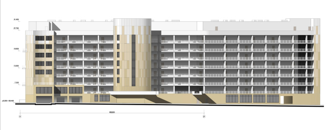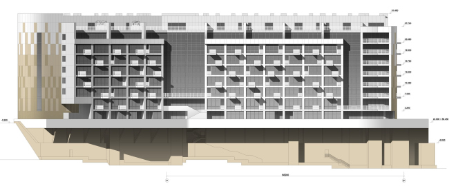 Итак, морской фасад заполнен сеткой окон, а противоположный – лоджиями; это делает дом прозрачным и воздушным. Для более плотной материи остается немного места: одна торцевая стена и два лестничных блока. Лестницы и лифты помещены в овальные объемы – так и хочется назвать их, по аналогии со средневековой архитектурой, «лестничными башнями». Или по аналогии с лайнером – корабельными трубами. Одна из таких башен расположена на юго-восточном торце дома (и размещена так, чтобы оставить место для пожарного подъезда и площадку для разворота), другая – примыкает к тыльному «балконному» фасаду. Объемы лестниц также отвечают за сходство нового дома с «Титаником» – они будут облицованы точно такими же панелями с плавным «пиксельным» переходом от песчаного до серебристого цвета, высветляя объемы кверху и уподобляя их окрестным горам.