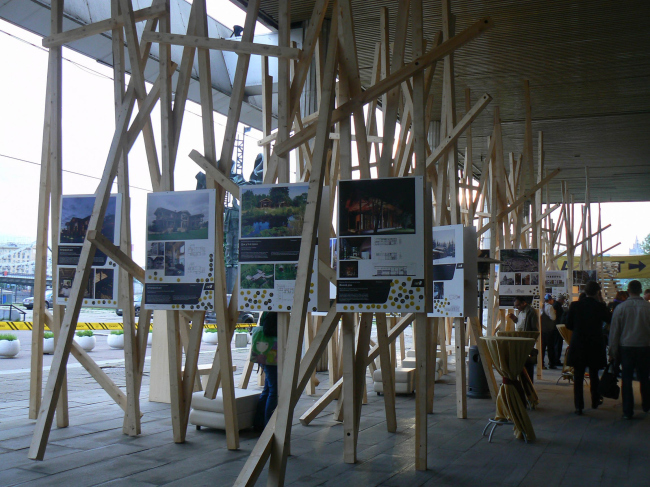 Последними завершающими штрихами стала выставка на Арх Москве проектов-победителей и награждение. Надо отдать должное этой экспозиции, сделанной архитекторами-дизайнерами Савинкиным и Кузьминым – пройти мимо, несмотря на обилие выставок Арх Москвы, было невозможно. Выставка АРХИWOOD расположилась прямо перед главным входом в ЦДХ и приветствует его посетителей сплетением деревянных конструкций, на которых закреплены планшеты с постройками шорт-листа премии по пяти номинациям.