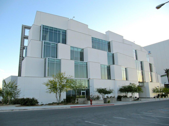Здание расположено в административном (и «историческом») центре города, пустынном и мало интересным по сравнению с районом казино — но там, благодаря широким улицам и низкой плотности застройки, оно заметно издалека. Постройка состоит из двух частей, которые напоминают всем критикам полушария мозга — в аспекте различий между их функциями. Состоящий из «стопки» чуть смещенных друг относительно друга белых прямоугольных блоков корпус с лабораториями, офисами и палатами пациентов противопоставлен завернутому в стальные листы объему Life Activity Center, зала для проведения общественных мероприятий (а также для сдачи в аренду с этой же целью, что должно приносить Центру стабильный доход). Его пространство наполнено солнечным светом, проникающим через множество окон, а криволинейные очертания одинаково причудливо смотрятся и внутри, и снаружи.