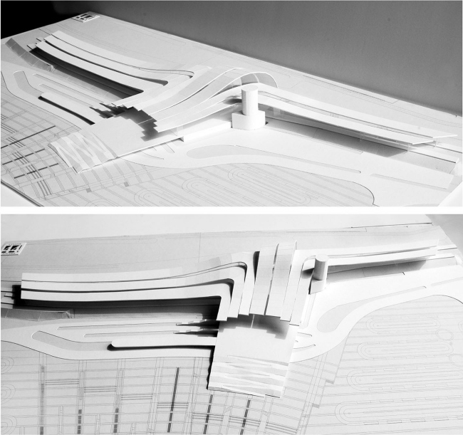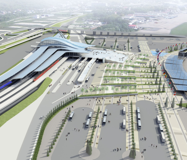 Существующие перепады высот архитекторы использовали максимально эффективно. Во-первых, разведены транспортные потоки: под пешеходной площадью (условно говоря, в самом низу) размещено автобусное сообщение (частично носящее временный характер, после Олимпиады оно будет ликвидировано) и вестибюль пригородного вокзала, уровнем выше – железнодорожные платформы и вестибюль вокзала дальнего следования. Во-вторых, само здание спроектировано как система видовых площадок: панорамный ресторан на отметках +10,50 – +11,12 м, распределительный зал вокзала дальнего следования на отметке +14,4 м и, наконец, зал ожидания на отметке +18,6 м. Каждый видовой уровень опоясан широкими террасами, с которых Олимпийский парк виден как на ладони, что позволит пассажирам легко сориентироваться в пространстве.