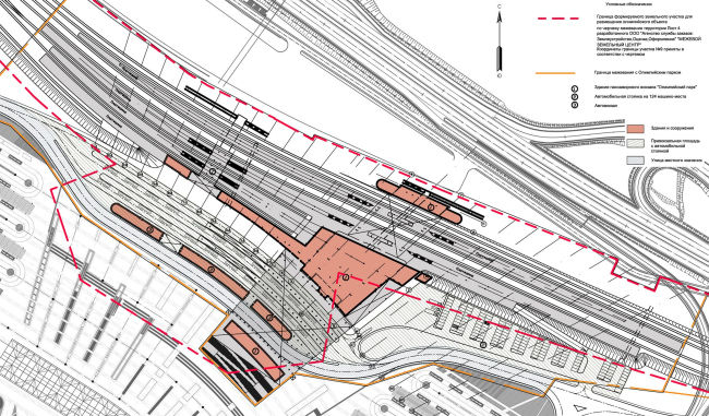 Никита Явейн вспоминает, что работа над проектом началась с тщательного анализа места строительства будущего вокзала. Участок, выделенный под эти цели, расположен прямо за Олимпийским парком (которому вокзал, как не сложно догадаться, и обязан своим названием), то есть примерно в полутора километрах от моря. В этом месте ландшафт Сочи резко меняет свой равнинный характер и устремляется в горы: будущая стройплощадка фактически представляет собой террасированный склон, перепад между «ступенями» которого составляет около 6 метров. «Мы понимали, что расположение вокзала над Олимпийским парком не только выигрышно, но и чрезвычайно ответственно, – рассказывает архитектор. – «Транспортные ворота» можно сравнить с воронкой, из которой в дни Олимпиады в парк хлынут людские потоки. Так мы и решили трактовать наш вокзал – как волну, как реку».