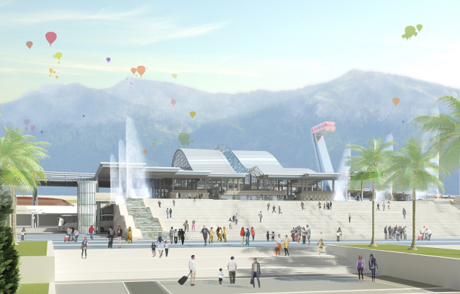 Облицованные серо-голубым цинко-титановым покрытием дебаркадеры действительно напоминают потоки воды, однако если это и река, то повернутая вспять. Потому что распростертые над Олимпийским парком крылья навесов, соприкасаясь друг с другом, неожиданно разворачиваются на девяносто градусов (строго говоря, образуют в прямом смысле узел) и вырываются вперед, к морю, образуя козырек, как будто собранный из нескольких лент, трепещущих на ветру. Тему стремительного проникновения подхватывает широкая белокаменная лестница, ведущая от вокзала к парку, – функционально она служит кровлей для автостанции, а эстетически придает всему сооружению торжественность и помогает вписать его не только в существующий ландшафт, но и в архитектурный контекст курортного города. «У лестницы есть и еще одна важная роль, – добавляет Никита Явейн, – она призвана задержать прибывающих пассажиров на какое-то время – в противном случае пиковая нагрузка окажется критичной и для входной зоны олимпийского комплекса, и для Олимпийского парка в целом. Этой же цели служит и привокзальная площадь на платформе с отметкой +6,3 м над уровнем моря. Она предназначена только для пешеходов и трактована как место встречи, обширное публичное пространство перед входом в Олимпийский парк. Праздничный, торжественный характер этой площади подчеркивают элементы благоустройства: фонтаны, скульптура, башня с часами и т.д.».