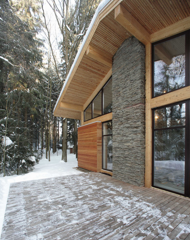 Важно подчеркнуть, что оба объема размещены на широкой плите – обшитая сверху деревом, она служит удобной летней верандой и частично накрыта навесом. Но самое главное, таким образом архитектор кардинально решил вопрос подвала. «Фактически реализовал свою давнюю мечту, – поясняет Роман Леонидов, – и спроектировал дом без подвала. Дело в том, что на стадии переговоров практически ни один заказчик не хочет иметь подвал, но когда мы начинаем делать ленточный фундамент и, соответственно, рыть котлован, в ста случаях из ста заказчику становится жаль терять так много места, и нам приходится переделывать уже готовый проект дома, изменять его пропорции и поднимать первый этаж. В данном же случае я решил не искушать судьбу и поставил дом на плиту – и, по-моему, его пропорции от этого сильно выиграли». Архитектор не лукавит: несмотря на свою довольно внушительную площадь (600 кв. м.), установленный на деку дом кажется изящным и едва ли не миниатюрным. Это впечатление многократно усиливают прозрачные стены гостиной, словно вросшие в деревянную платформу, и широкие свесы скатной кровли, с внутренней стороны также обшитые лиственницей. И если второй объем, обращенный к улице, состоит из брутальных кирпичных и каменных плоскостей, то прозрачный сшит лишь несколькими деревянными ребрами и каменным остовом каминной трубы.