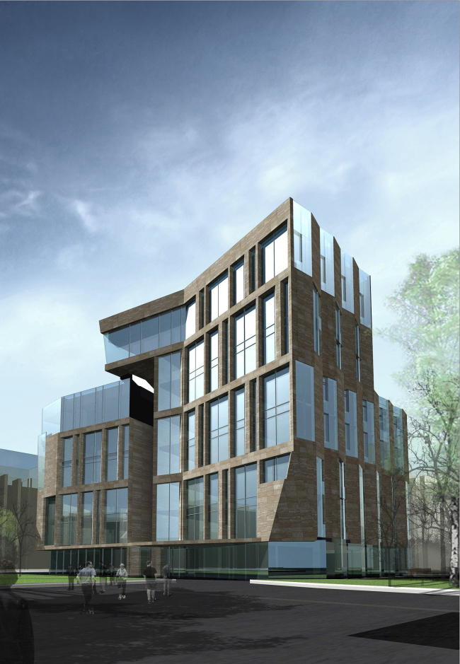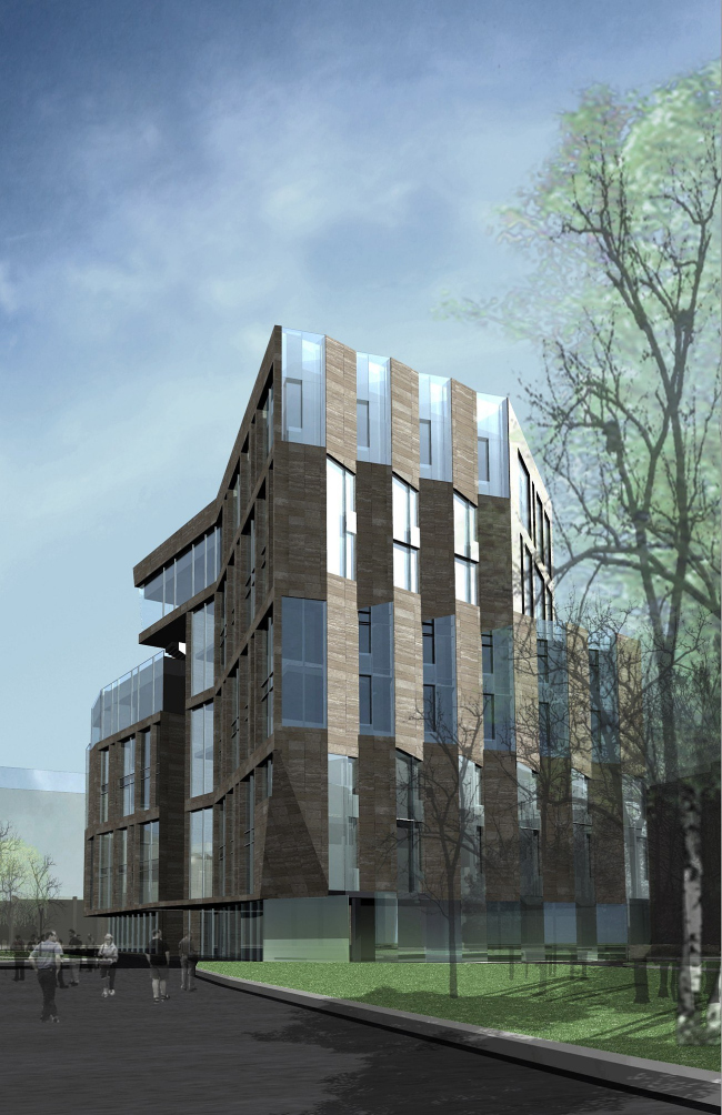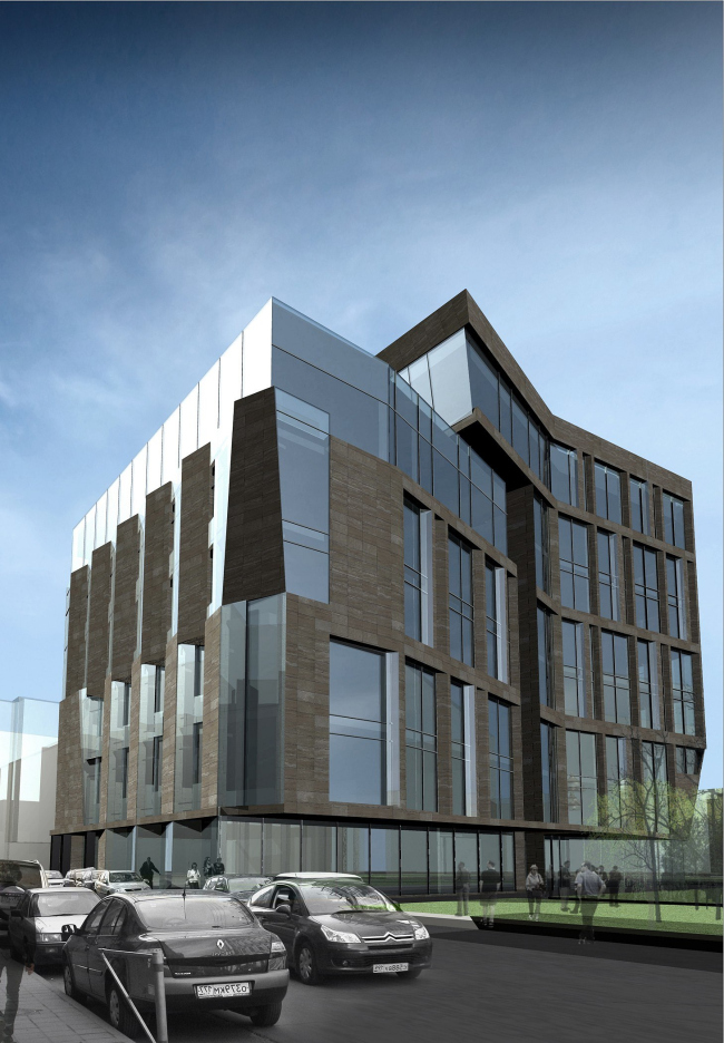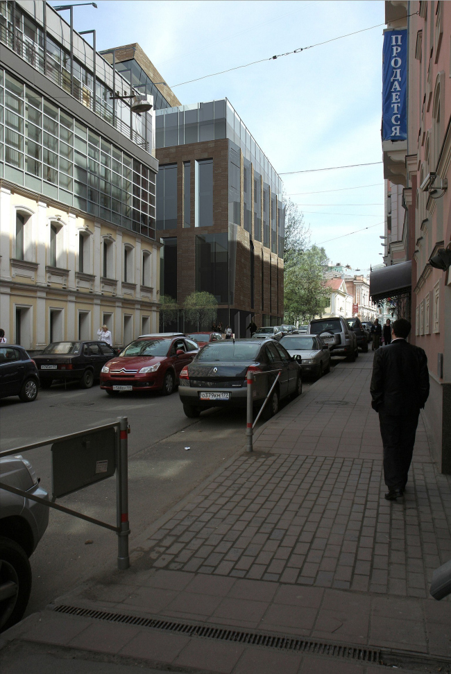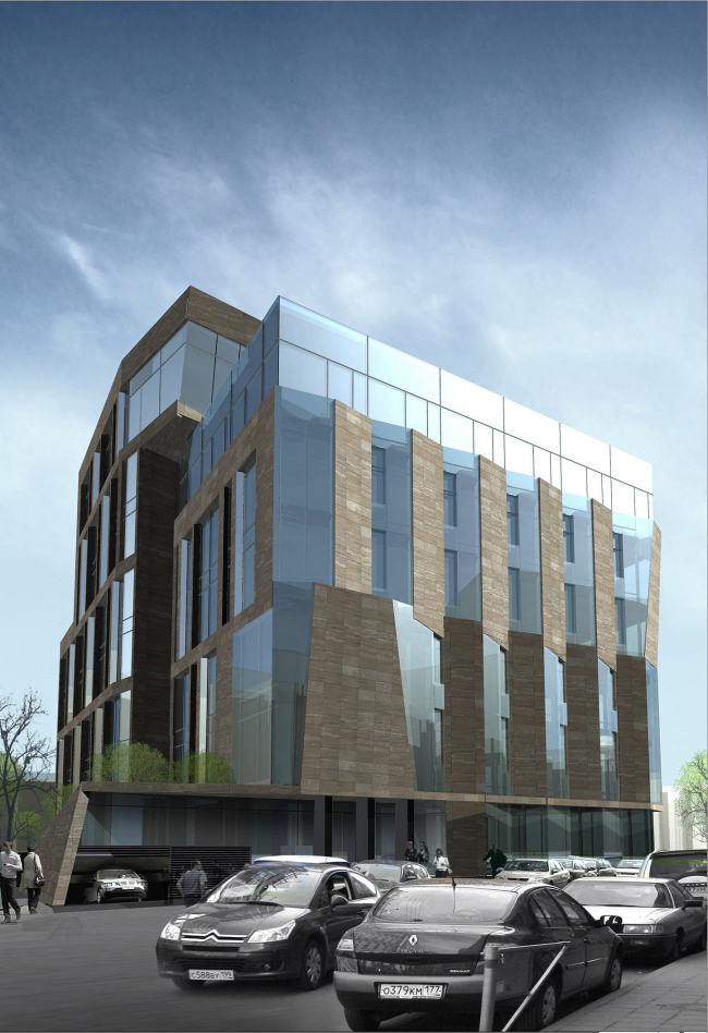 Верхний уровень шестиэтажного объема задумано полностью остеклить, для облегчения силуэта здания при взгляде из переулка. Зато основные этажи архитектор, чья творческая манера в сознании критиков прочно связана с лаконизмом и простотой, неожиданно наделяет самой активной тектоникой. В частности, Владимир Плоткин не стал полностью отказываться от идеи фасада, чья плоскость расположена под углом к переулку. Но: угол превратился в ряд треугольных выступов-эркеров, а для того, чтобы еще больше подчеркнуть ломаную структуру получившейся поверхности, автор облицовывает их грани по-разному – одну одевает в травертин, другую оставляет прозрачной. Вертикальные тяги треугольных выступов объединяют этажи попарно (попутно уменьшая масштаб, так как два этажа снаружи выглядят как один ярус) – у второго и третьего этажей каменная плоскость слева, а у четвертого и пятого справа. Таким образом фасад превращается в две разнонаправленные гребенки. И если вблизи его поверхность завораживает игрой фактур и плоскостей, то издалека такой фасад воспринимается как мираж: в зависимости от угла зрения и освещения, он то ли присутствует в панораме исторического переулка, то ли нет. Задний фасад решен похожим образом, только «гребенок» здесь уже не две, а четыре, отчего чередование ярусов становится более заметным. Заметим, что похожий прием был использован Владимиром Плоткиным в проекте жилого комплекса «Заречье», о котором мы недавно писали; только там масштаб крупнее и треугольные складки «каменных жалюзи» покрывают округлые поверхности.