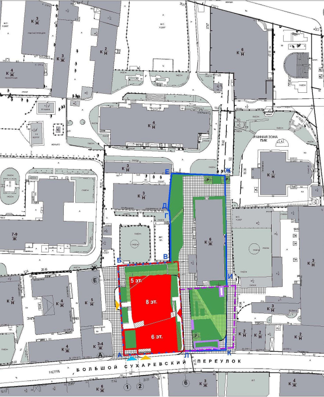 Отведенный участок имеет форму неправильного прямоугольника, вытянутого с юга на север, от Большого Сухаревского переулка в глубину квартала, где три оставшиеся границы территории окружены скверами. Ближайший сосед по красной линии – пятиэтажное офисное здание с западной стороны, диктует новому дому, исходя из правил современного проектирования в московском центре, сравнительно небольшой масштаб. С другой, восточной, стороны расположен сквер, «приписанный» к проектируемому комплексу, – под ним будет размещена подземная автостоянка.