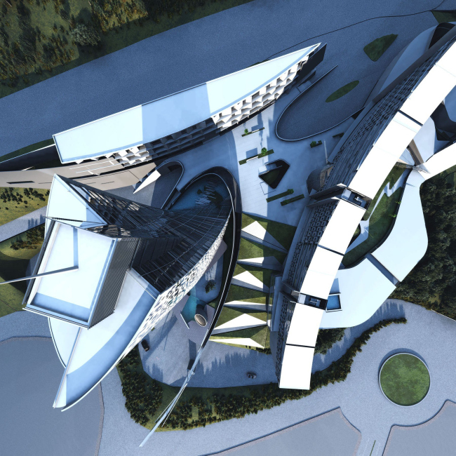 Помимо гостиницы, проект многофункционального центра включает в себя бизнес-центр, жилой комплекс и автостоянку, рассчитанную на 2000 машин. Последняя расположена под землей, а два других объема решены в виде горизонтально вытянутых и загнутых в разные стороны – тоже ради вида на Арарат, конечно! – пластин. Получившиеся дуги словно обнимают отель, расступаясь перед горой и, наоборот, сужаясь по направлению к улице Теряна и играя для города роль своеобразных пропилей. Между ними расположена озелененная пешеходная площадь, имеющая несколько террас. Вообще же из 4,5 га, отведенных под строительство нового комплекса, японский архитектор занял лишь половину, а всю остальную площадь отвел под озеленение и ландшафтный дизайн. Это решение восхитило всех членов жюри, ведь благодаря ему Ереван приобретен не только новую высотную доминанту, но и обширный сквер, подчеркивающий очарование существующего рельефа.