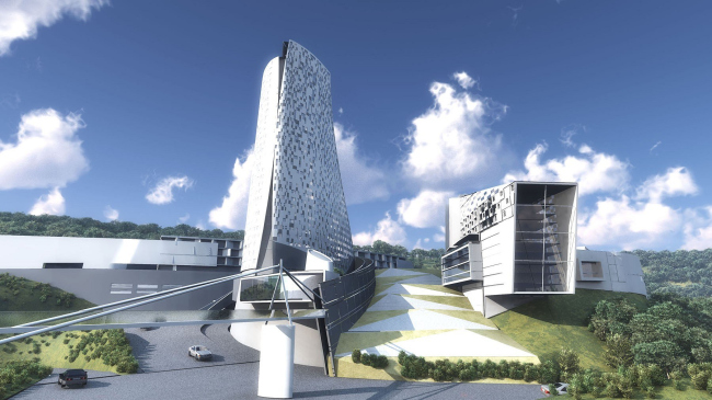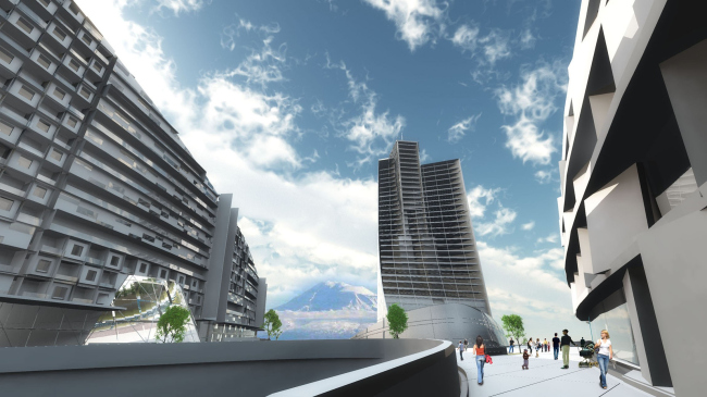 Как и почти для всех участников этого конкурса, главной точкой отсчета и центром системы координат для Киёкадзу Араи стала заснеженная вершина Арарата. Однако если европейские архитекторы, как правило, проектировали высотный объем, способный соперничать с силуэтом библейской горы, то Араи остался верен традиционному японскому стремлению к целостности и созерцательности. Созданный им небоскреб не просто прорастает из ландшафта, но становится его логичным и неотъемлемым продолжением. В плане высотный объем имеет условно треугольную форму, так как составлен из нескольких сегментов – двух треугольников с закругленными длинными сторонами и врезанного в них куба. Своим острым углом небоскреб обращен к Арарату, а его покатые округлые бока, облицованные бело-черными пикселями недвусмысленно напоминают присыпанные снегом горные склоны. Третий фасад, смотрящий на город и расположенный точно по оси улицы Теряна, полностью остеклен, однако назвать его банальной прозрачной плоскостью язык не поворачивается – настолько причудливо и многообразно он изогнут. Кажется, что по нему прошелся мощный ураган, но на самом деле такая пластика объясняется желанием архитектора сориентировать максимальное число номеров на библейскую гору.
