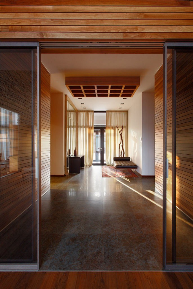 Кстати, не в последнюю очередь именно большие окна, сквозь которые окружающий пейзаж словно входит в комнаты, заставили архитекторов выстроить целую систему связей между архитектурой дома и его интерьером. В частности, стены двусветной гостиной и лестничные блоки отделаны тем же натуральным камнем, что и фасады («Я просто вывернула их наизнанку», – с улыбкой поясняет главный архитектор проекта Анастасия Леонидова), тогда как в оформлении коридора, а также полов и потолков большинства помещений использована деревянная рейка. И если на пол положен африканский орех, то стены обшиты орехом обычным – архитекторы отдали предпочтение именно ему за насыщенный медово-терракотовый оттенок. Ключевую роль в создании облика жилого пространства играет и стекло. Все общественные зоны первого этажа отделяются друг от друга прозрачными раздвижными дверями, а в стенах столовой также сделаны стеклянные ниши. С одной стороны, это делает комнаты светлее, с другой позволяет обеспечить необходимую звукоизоляцию.