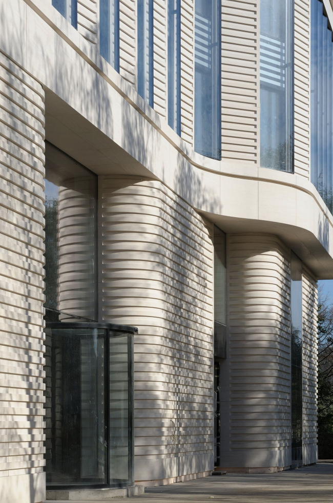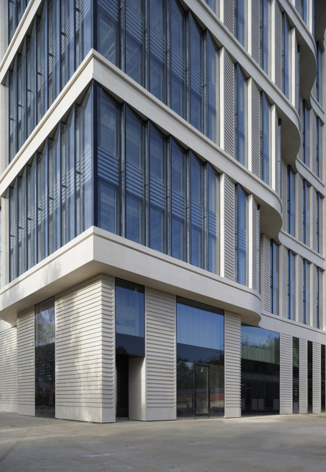 Подойдя ближе, замечаешь, что все окна и каменные блоки между ними повернуты к плоскости фасада под определенным углом. Подобный динамизм скрадывает массивность элементов, из которых набрано здание, – шестиметровых единых стекол и толстых плит бразильского известняка. И если на прямой плоскости «зубья» выглядят как вертикальные жалюзи (эту ассоциацию многократно усиливает украшающий каменные плиты рельеф из горизонтальных полос), то поверхности эркеров они превращают в гигантские шестеренки. «На наш взгляд, подобную форму нужно одевать или в гнутое стекло, или как-то специально обыгрывать, потому что набранная из отдельных стекол она неизбежно воспринимается как граненый стакан», – поясняет один из авторов проекта, руководящий партнер бюро SPEECH Сергей Кузнецов.