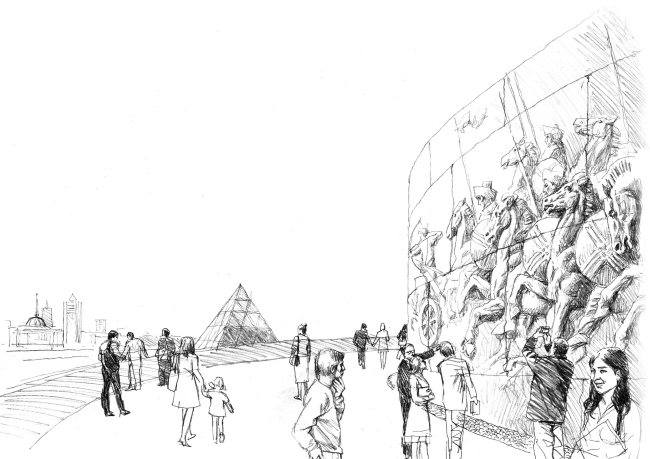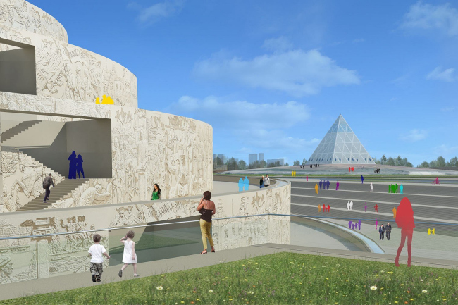 В разработанном проекте две главных спиралевидных траекторий. Одна проходит внутри здания, и двигаясь по ней, посетители музея получат возможность совершить последовательный экскурс в историю Казахстана от древнейших времен до наших дней. Второй спиралевидный пандус обернул здание снаружи – это прогулочная дорожка, пущеная по эксплуатируемой кровле сооружения. По ней можно будет подняться на вершину комплекса, рассматривая по пути панорамы Астаны и барельефы на темы казахской истории, образующие непрерывную ленту на фасадах. Важно и то, что на каждом этаже внешний и внутренний пандус соединены специальными переходами, так что с изучения истории в любой момент можно будет переключиться на знакомство с пейзажами сегодняшнего дня.
