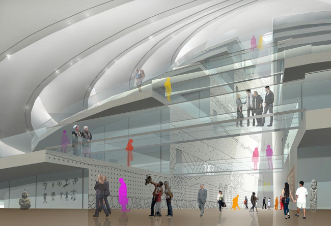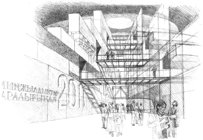 Проектом предусмотрено, что поднимаясь на верхний уровень на панорамном лифте, посетители смогут пешком спускаться по пологому пандусу от раздела древнейших времен к разделам новейшей истории республики Казахстан. Метафорически это путешествие можно представить как спуск с горных вершин в цветущую долину. И, как оказалось, это очень точно соответствует представлениям казахских экспертов о развитии своего государства – придуманная «Студией 44» структура музея была особо отмечена всеми членами жюри.