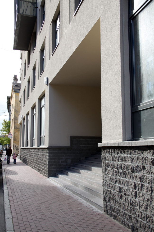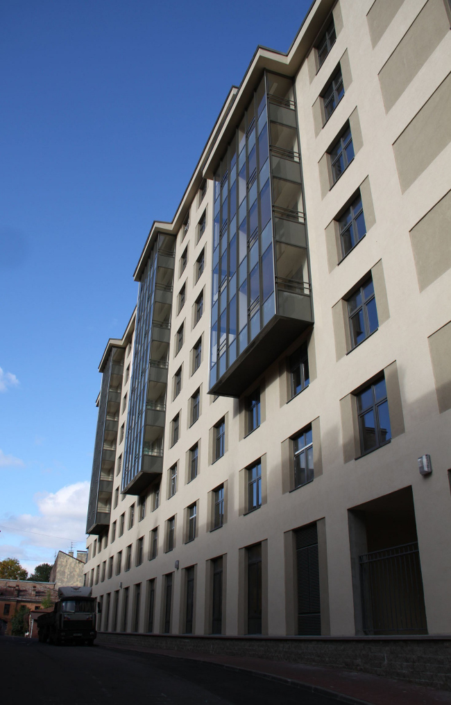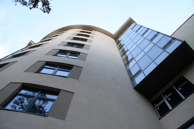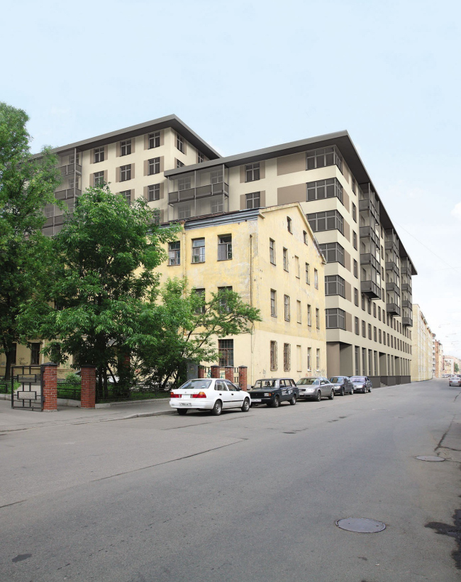 На первый взгляд, выбор именно конструктивистских построек в качестве основного стилистического ориентира кажется нелогичным – ведь прямо напротив расположен памятник эпохи модерна, который, кажется, так и напрашивается на диалог со своим новым визави. Однако Герасимов привык думать не только об архитектурном контексте, но и об экономике проекта. Он уверен в том, что стилистические изыски хороши там, где имеется солидный бюджет. «Если бы мы взялись проектировать дом эконом-класса в неомодерне, риск получить очень среднее качество архитектуры и декора был бы чрезвычайно велик. Куда больших финансовых вливаний требуют и любые попытки кардинально обновить лицо того или иного квартала, то есть спроектировать дом в современной стилистике, поэтому мы сделали ставку на конструктивизм». Конечно, художественный язык этого стиля подвергается довольно серьезному переосмыслению. В частности, и габариты дома, и планировки квартир продиктованы современными представлениями о комфорте, а отделочные материалы выбраны хоть и простые, но стойкие и долговечные. И все же именно благодаря «проконструктивистской» работе формой, а не деталью, Герасимов стопроцентно попадает не только в бюджет заказчика, но и в архитектурный контекст непростого в градостроительном отношении района.