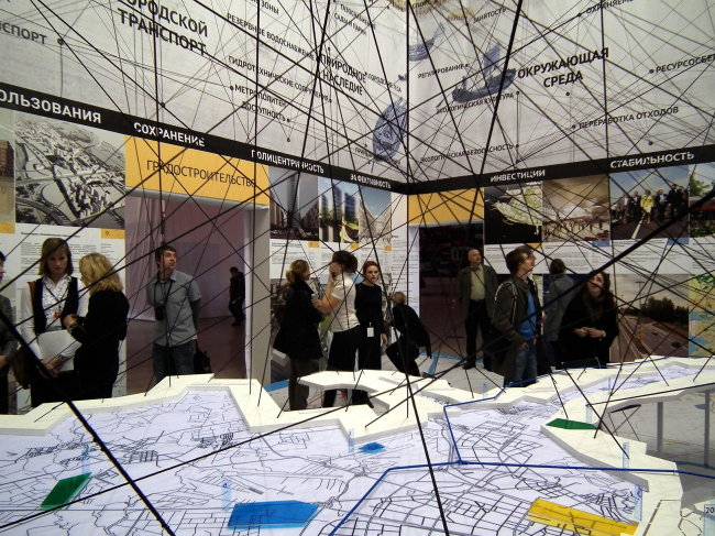 Среди таких экспозиций безусловно лучшая и самая красивая – в павильоне Петербурга. Он посвящен знаковым стройкам города (среди них Пулково, Мариинка, Невская ратуша, Балтийская жемчужина), которые разделены на несколько типологических групп – можно подумать, что для ясности, но на самом деле, конечно же, для красоты. Центр павильона занят схематичной картой города, где цветом и цифрами обозначено местоположение объектов. Между картой и стенами хаотически натянуто множество черных бечевок – их концы на стенах указывают на разные умные слова (слов много, например, «экологическая культура», «регулирование», и даже «доступность»). Очевидно, что бечевки обозначают множественные и перекрестные связи между понятиями, реальностью и сложно еще сказать чем. Правда, к карте они привязаны как-то произвольно, но в качестве декоративного приема выглядят замечательно.