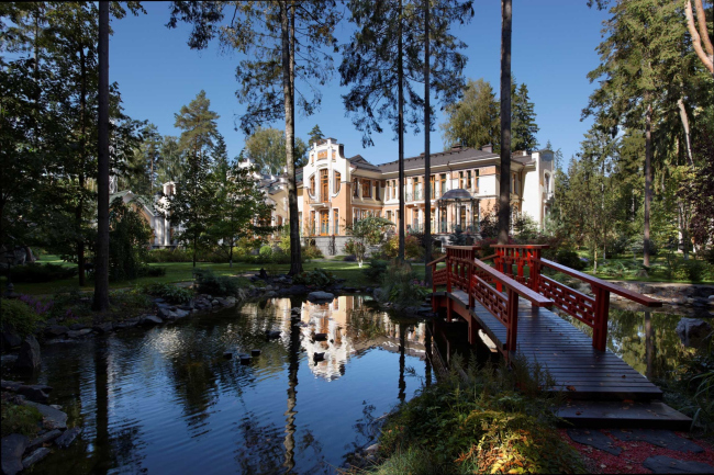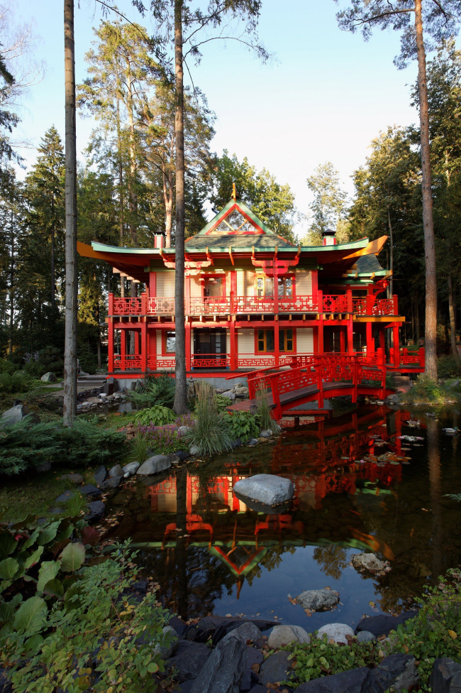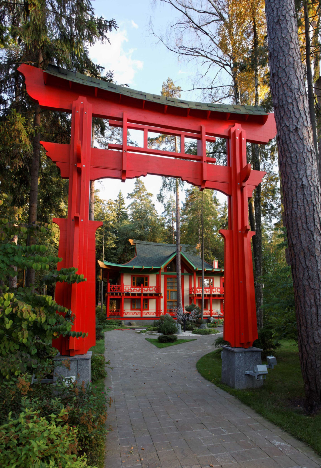 В восточной части парка расположился японский домик дочери хозяев с ярко-красным каркасом и приподнятыми углами крыши, с трех сторон окруженный живописным прудом с горбатым мостиком и смягченным вариантом сада камней вокруг. «Это не Китай и не Япония, – рассказывает архитектор, а нечто среднее, имитация, больше всего похожая на русское и европейское шинуазри XIX века». Мощение каменных дорожек здесь расступается, прорастает травой, – а вход на территорию условного «востока» обозначен деревянными (тоже красными) воротами, которые стоят на одной из трех главных аллей.