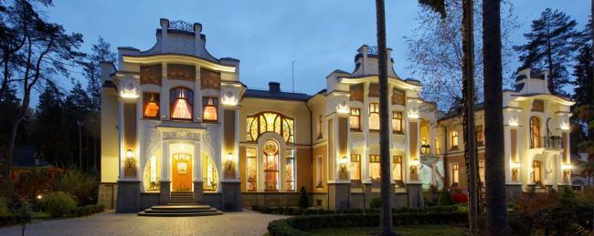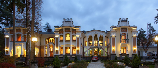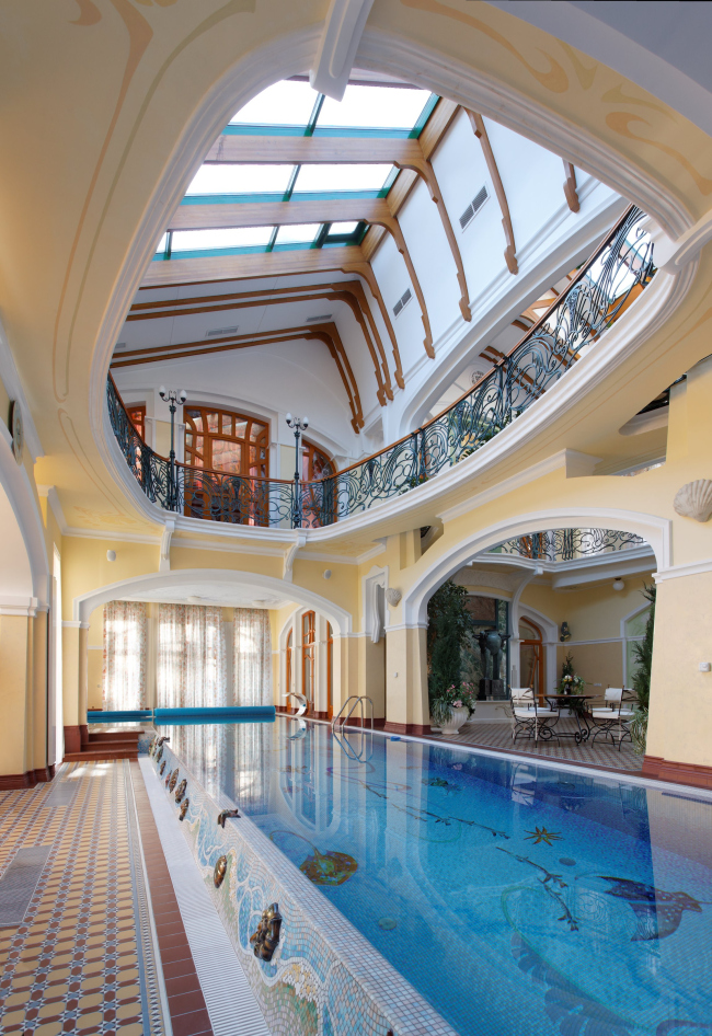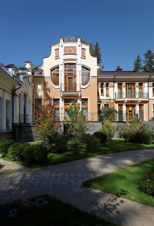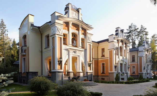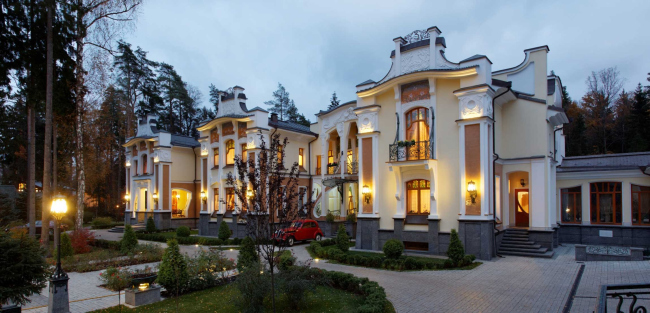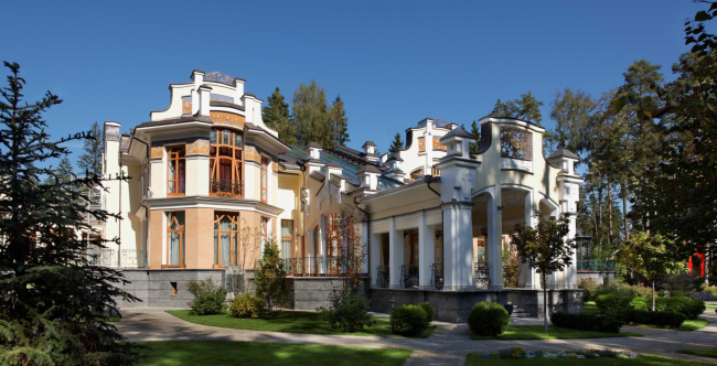 В точности повторить какой-либо образец стиля модерн начала XX века архитектор, конечно же, не мог. Прежде всего по самой банальной причине: стилизация стилизацией, а дом должен быть современным и предоставлять своим обитателям значительную часть благ современной цивилизации: гаражи на несколько машин, в том числе для обсуживающего персонала и охраны, бассейн внутри дома (к нему мы еще вернемся). Из особенных удобств назовем одно: между домом охраны и главным домом устроен подземный переход, для того, чтобы в непогоду хозяева могли выйти из машины и войти в дом, не намокнув от дождя («не попасть под камни с неба» – шутливо поясняет архитектор). Кроме того, масштаб и размер дома тоже вполне современен, а вовсе не апеллирует, как можно было бы подумать, к историческим дворцам: «дом-двухтысячник» (площадь главного дома «усадьбы Модерн» – 1700 метров) стал за последние 10 лет своеобразным эталоном богатого подмосковного дома. Однако в эпоху модерна типология дворца совершенно не сложилась – дворцы остались в XIX веке, возродившись позднее, в 1910-е, но уже в стилистике неоклассики. Модерн строил: вокзалы, пассажи, многоэтажные доходные дома, а в качестве частного жилья – деревянные пригородные дачи и каменные городские особняки. Поэтому даже словосочетание «усадьба Модерн» звучит несколько неожиданно: в начале XX века усадьбы с их вишневыми садами и модерн с его дачами, для размещения которых вырубали эти самые сады, были скорее антагонистами. Словом, типологию загородного дворца в стиле модерн архитекторам пришлось во многом изобрести.