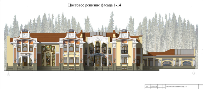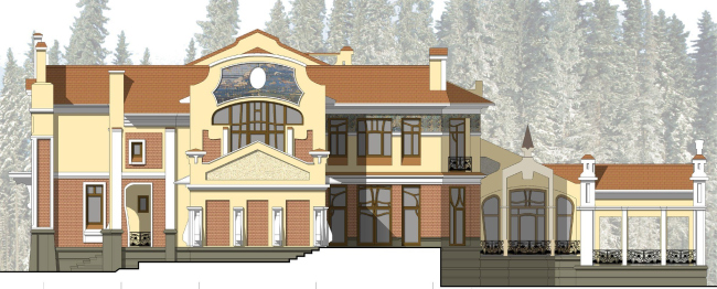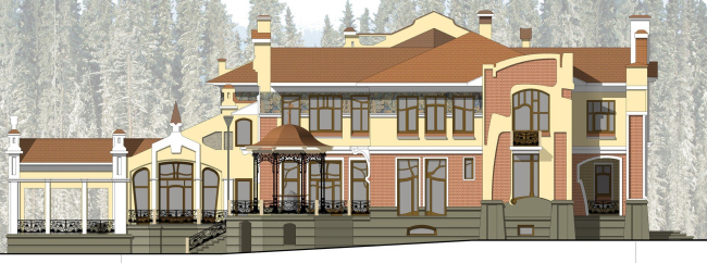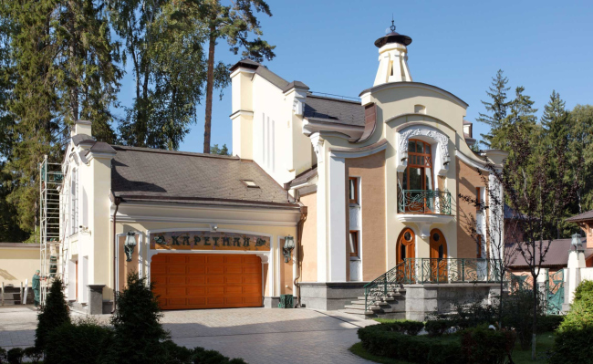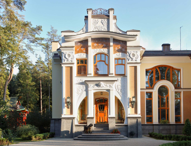 Вторая особенность частного заказа – большинство клиентов (не то чтобы абсолютное большинство, но процентов девяносто наверняка) предпочитает исторические стили. В данном случае заказчик попросил архитектора построить дом в стиле модерн. Причина этого пожелания была не столько эстетической, сколько, скажем так, родословной: предки хозяйки (а дом строился к ее юбилею) владели, в числе прочего, домом на Волге, построенным в начале XX века в стиле модерн.