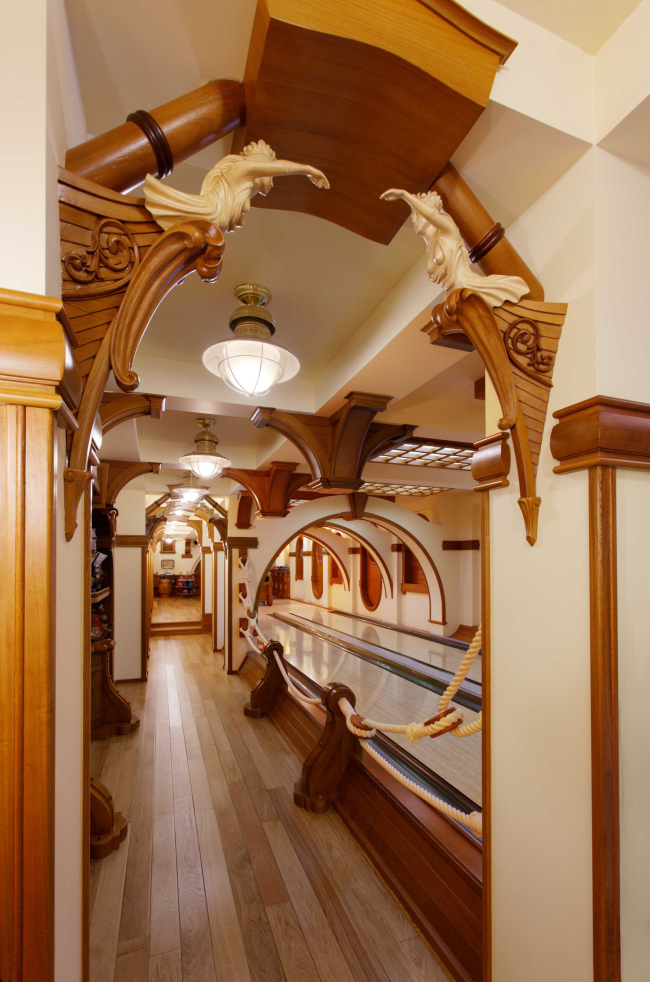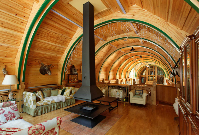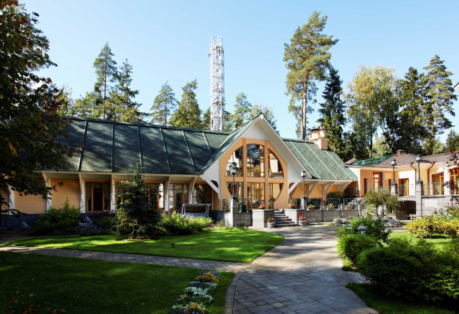 Все остальные постройки этой виллы-усадьбы – деревянные. Справа от главного дома находится здание банкетного зала (опять англомания, отдельный banquet hall), вытянутое вдоль юго-западной границы участка. Вначале его объем был задуман как дом-забор, чтобы отгородиться от котельной на соседнем участке. Затем, когда стало известно, что хозяева планируют вечеринку с очень большим количеством гостей – архитекторы предложили превратить это здание в своего рода дом приемов. Получился длинный деревянный зал (все здания усадьбы, кроме главного дома, построены из дерева), перекрытый замечательными деревянными сводами, – которые, кстати говоря, весной получили награду АрхиWood. Сам свод, строго говоря, пятигранный, но множество сильно выступающих циркульных ребер создает эффект длинного цилиндрического свода, и одновременно придает интерьеру сходство с ажурными чугунными конструкциями пассажей и вокзалов XIX века. Самое замечательное, что паркет на полу состоит из панелей, которые можно разобрать, и тогда банкетный зал превращается в каток. Эта забавная затея едва ли не уникальна среди современных подмосковных владений: бассейны, теннисные корты и гольф-поля есть, а крытые персональные катки пока еще на получили распространения.