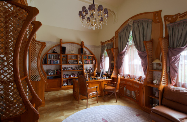 Получилось похоже. Женские маски, ирисы, лебеди, ландыши и лилии; гнущиеся стебли, множество изогнутых линий – на фасадах, камине, коврах, стенных шкафах, деревянных перегородках, в пастельной живописи Оринянского на стенах и потолке… Может быть, немножко даже слишком похоже, плотность узнаваемых мотивов великовата, глазу как будто бы постоянно предлагают дополнительные доказательства сходства с избранным стилем.