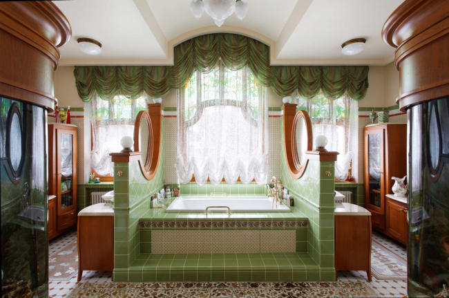 Что еще важнее – обильный декор сделан настолько тщательно, дотошно и аккуратно, что украшения приобретают, волей-неволей, новое качество: мы имеем здесь дело с ремесленным мастерством высокого класса. «Мы проектировали и строили этот дом долго, почти пять лет, – рассказывает Олег Карлсон. Сами рисовали все, и ландшафт парка, и интерьеры. В конечном счете под нашим руководством над «усадьбой Модерн» работало 20 мастерских разной специализации: рельефы, кованые решетки, майолика, большая часть мебели – все это с начала до конца делалось под нашим наблюдением, мы как архитекторы практически не покидали объект». Например, архитекторы долго искали плитку пола, подходящую для рубежа XIX-XX веков, пока не нашли нужный образец на барселонской выставке. Мебель частью закупили у итальянской фабрики «Медея», но тамошняя коллекция в стиле «модерн» оказалась настолько мала, что многое архитекторы заказали по собственным рисункам; нарисовали множество встроенных шкафов, панелей, ширм и прочего. Дом и снаружи, и изнутри отделан как драгоценная шкатулка.