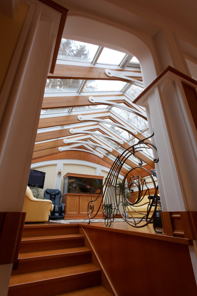 Во всем этом нет ошибки (исторически «чистого» модерна тоже не очень много, он часто с чем-то перемешан, то вольно, то невольно), но есть неуловимое ощущение какого-то дополнительного влияния, кроме модерна. Мне кажется, что это дополнительное – готика. Точнее, не слишком артикулированное веяние этакой готической англомании. Отсюда упомянутая вначале длинная гостиная с камином, обилие окон и витражей, плоские деревянные ребра между стеклами в атриуме, образующие над зимним садом нечто вроде перевернутого корабельного днища; легкие конструкции потолков второго этажа (замечательные потолки, ни грамма пенокартона нет на них, они одни связывают дом с аутентичным началом века, вот только они все же больше тяготеют к самому концу XIX века, к историзму и его конструкциям, чем к модерну; впрочем, модерн как ближайший наследник вполне мог использовать эти темы и использовал их, когда хотел). То есть, помимо образцов из области «чистого» модерна, здесь обнаруживается призрак особняка Морозова на Спиридоновке.
