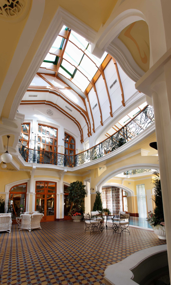 Есть и отличия; из них самое ощутимое – отсутствие массы. Модерн любил массу, любил прервать густую лепнину или живопись вдруг инертной стеной, позволяющей почувствовать тяжесть подосновы, скульптурную вязкость здания. Здесь подход к стилю более графичный, «книжный». Стена здесь больше плоскость, чем массив или скульптура. Поэтому ее можно прорезать: что происходит на фасаде лоджии, выходящей в партер из зимнего сада, или в интерьере атриума, где опоры проникают сквозь отверстия в междуярусном перекрытии, а над архивольтами тоже обнаруживаются вместо стен отверстия (заставляющие вспомнить о популярной недавно деконструкции). Модерн также не любил филенок и оконных наличников, которые в этом доме можно найти.