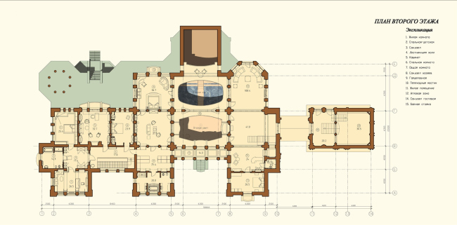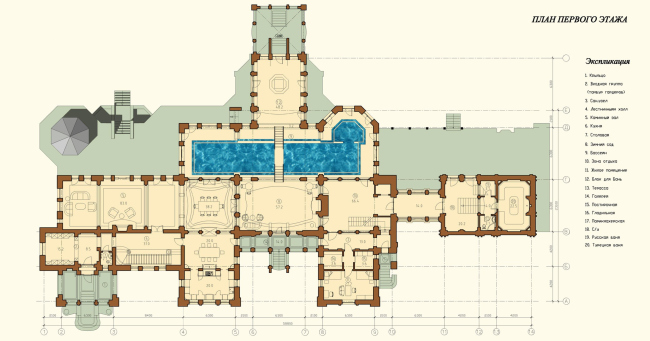 Дом, который снаружи кажется одним большим дворцом, на самом деле, – рассказывает архитектор, состоит из трех частей. Слева – собственно главный дом, жилище хозяев, который тоже спланирован «покоем» и почти симметричен. В его левом ризалите располагается упомянутый выше главный вход, – глубокое (6х5 метров) крыльцо, ведущее в относительно узкий вестибюль. Войдя туда, надо повернуть направо, и пересечь совсем уже небольшой тамбур, чтобы попасть в обширное двусветное пространство с лестницей на второй этаж. Лестница ведет наверх к спальням, а из холла можно попасть либо пройдя вперед – к повседневной столовой и кухне (по 20 метров то и другое), либо, повернув налево – в парадную часть, вытянутую вдоль дома со стороны сада: еще одна столовая (расписной плафон, деревянные шкафы, высокие спинки стульев, торжественность семейного обеда), дальше розовый рояль, гигантский камин-скульптура, диваны, подушки, гнутые ножки… Для большей цельности пространства стены заменены широкими арками, которые служат скорее для обрамления, чем для ограничения – и получается похоже на 'long hall', галерею-гостиную английских загородных дворцов.