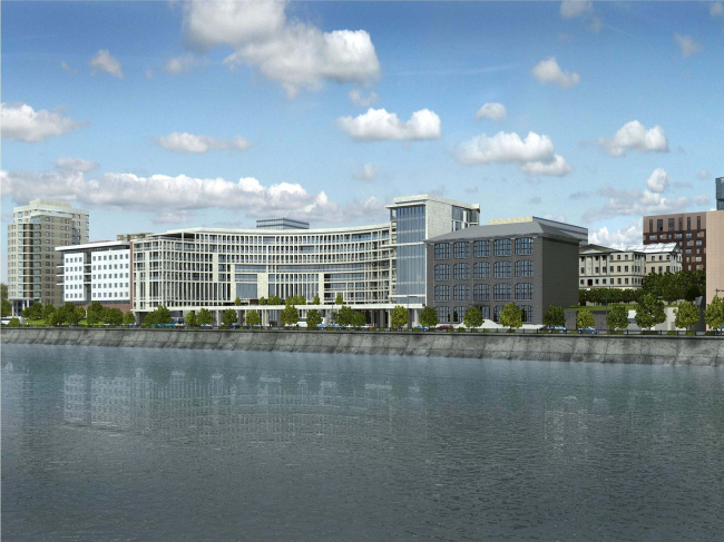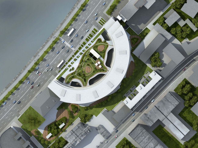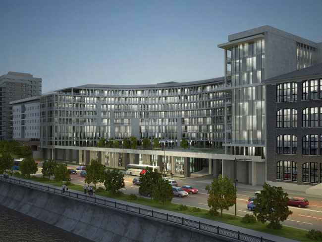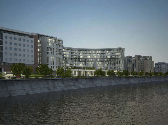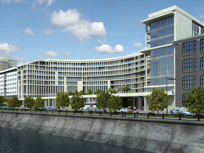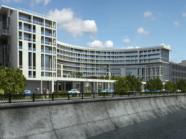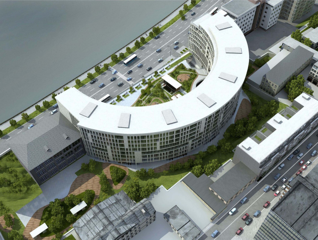 На месте бывшего прядильно-ткацкого производства «Гардтекс» на Саввинской набережной архитектор Владимир Плоткин предлагает построить жилой дом полукруглой формы с эффектным парадным курдонером.