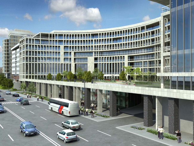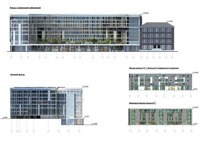 Кроме сохраняемого здания цехов, в состав комплекса входят еще три корпуса: 4-хэтажный жилой дом, замыкающий фронт застройки по Большому Саввинскому переулку, основной 8-этажный объем, имеющий полукруглую форму, и одноэтажный корпус «D», поддерживающий линию застройки Саввинской набережной. Последний фактически представляет собой «вкладыш» в полусферу, к которой он, правда, не прилегает вплотную, а перебрасывает несколько переходов на уровне озелененной кровли. С обратной стороны дома также разбивается сквер, и зеленые дворы «перетекают» друг в друга на уровне первого надземного этажа «дуги». Владимир Плоткин с гордостью отмечает, что оба двора удалось полностью освободить от машин. Именно для этого, кстати, архитекторам и понадобилось отделять жилой полукруг от общественного блока – между корпусами организован заезд к подъездам, а отсутствие над ним сплошной кровли делает дом доступным для пожарной техники.