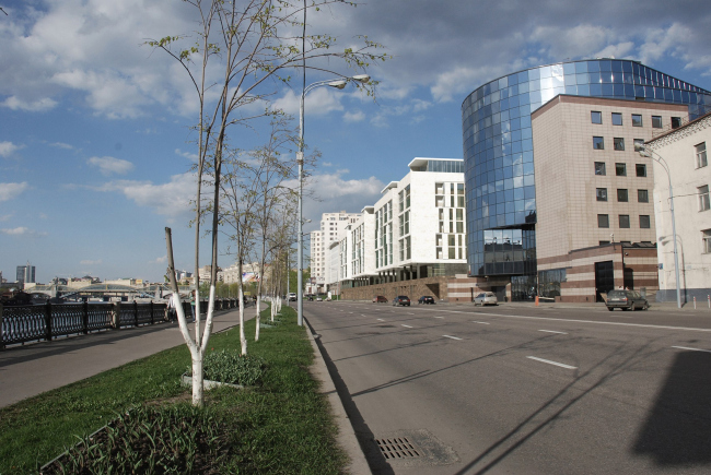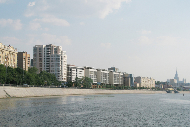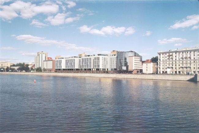 По глубокому убеждению архитекторов, в ряду столичных набережных Саввинская – играет отнюдь не главную роль, скорее, она всегда была фоновым элементом в общем строе архитектурной партитуры Москвы-реки, – и им казалось очень важным отразить это в облике нового комплекса. Иными словами, ставка изначально делалась на сдержанную архитектуру и деликатные методы градостроительного «имплантирования» жилого квартала в застройку набережной. В частности, это продиктовало постановку основного объема вдоль реки и ограничило его высоту высотой соседних зданий. Органично следовало отсюда и цветовое решение комплекса – он должен был быть светлым, как практически вся окружающая застройка. Хотелось архитекторам сохранить и зазор между первой и второй линиями застройки набережной, который сложился здесь исторически, из-за имеющегося довольно сильного перепада рельефа. Именно поэтому новые объемы сконцентрированы по периметру участка, и вся композиция строится на диалоге озеленения и привычной для жителей центра города плотной городской ткани с фиксированными границами квартала.