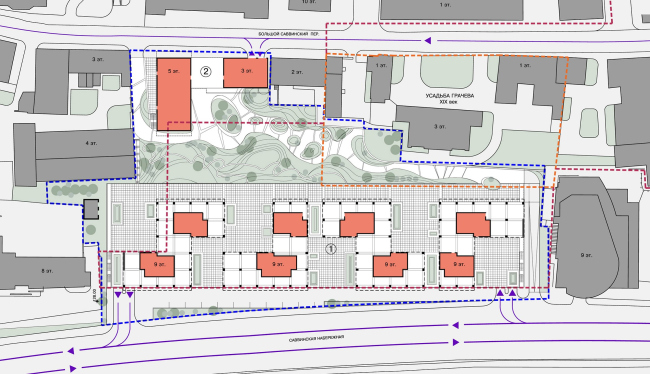 «Мы определили на генплане условную полосу принадлежности набережной и предложили застроить ее максимально плотно, собрав объемы таким образом, чтобы к воде был обращен единый фасад, – поясняет главный архитектор проекта Андрей Никифоров. – Вторая линия комплекса – дом по Большому Саввинскому переулку. Пространство же между домами – тот самый зазор, – превращается в полноценный ландшафтный парк». По диагонали участка, от набережной к переулку через парк идет эспланада, которая используется как рекреационная зона, а также позволяет обеспечить проезд пожарного транспорта. Для всех прочих машин парк закрыт – это стало возможным благодаря тому, что заезд в подземные гаражи осуществляется только с набережной и из переулка.