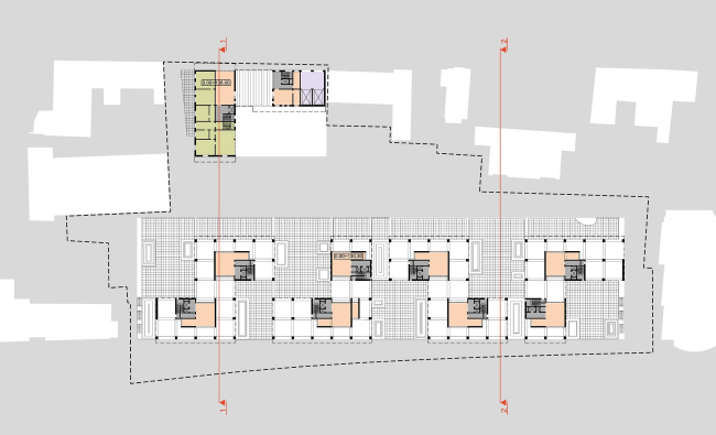 От улицы парк полностью скрыт благодаря стилобату, на котором стоит ориентированный вдоль реки корпус. На красной линии этот объем создает перепад в один этаж – в цокольном этаже размещаются художественная галерея, магазины и кафе, на подземном уровне – парковка. А выше объем распадается на четыре самостоятельных фрагмента. Дело в том, что глубина застройки, заданная фланкирующими участок зданиями, довольно существенна, и без дополнительных двориков и проемов новый жилой объем грозил оказаться «великой китайской стеной». Поэтому архитекторы разрезали воображаемый параллелепипед на несколько разных по своей форме частей и «растащили» их в разные стороны – так и появилась композиция, напоминающая фигуры компьютерной игры «Тетрис». Подобная компоновка жилых объемов неизбежно лишает некоторые квартиры видов на реку. И это именно тот пункт технического задания, который архитекторы сознательно нарушили. «Нам показалось, что вид на парк ничуть не менее ценен и что среди будущих жителей найдется немало тех, кто предпочтет уютный двор героическим видам панорам», – признается Андрей Никифоров.