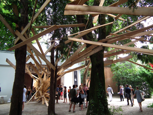 В этом году строительство деревянных макетов чего-либо в натуральную величину (иногда немного меньше) было исключительно популярно среди национальных павильнов. Это можно понять как буквальный отклик на обещание Седзимы вернуть архитектуру на биеннале - ее таки стали строить прямо в павильонах.
