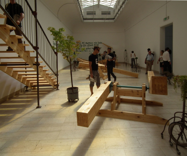 Цветов, кстати сказать, на биеннале предостаточно (не знаю, может быть теперь, под конец, часть отцвела, но что-то наверняка осталось). Можно подумать, что за самую политкорректную из совреемнных архитектурных тем, за экологию, теперь отвечают напрямую растения, как в срубленном виде (досок), так и в самом натуральном. Греки, например, соорудили внутри своего павильона (опять же деревянную) конструкцию, напоминающую слегка изогнутый дом-корабль на ножках: