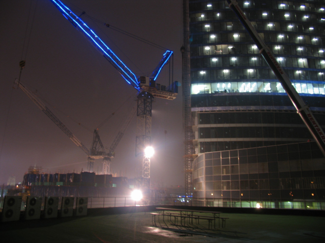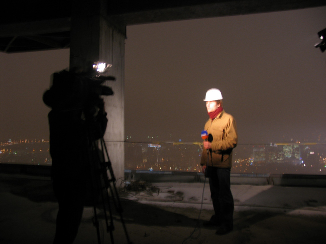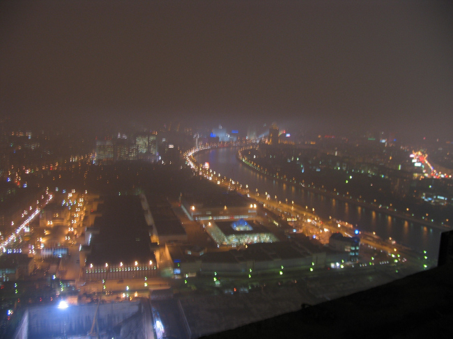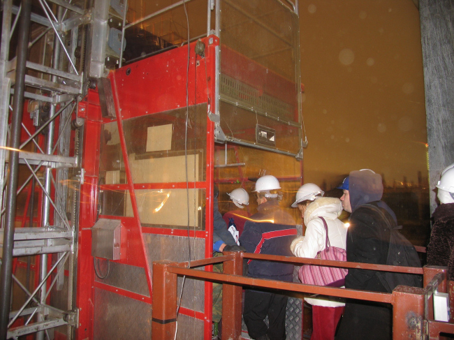 После рассказов о жизни башен началось самое интересное – восхождение на верхнюю точку. Хотя путешествие проходило по меньшему небоскребу, оно было захватывающим, поскольку немногим удавалось видеть Москву с 46 этажа (150 метров) – прямо таки с высоты птичьего полета… и тем более подниматься в свободно-парящем строительном лифте, который тянет тебя вверх по фасадной плоскости, постепенно уводя все дальше от земли и раскрывая панораму ночного города. На сорок шестом этаже еще вовсю дует ветер и подступ огорожен канатным тросом на расстоянии 2-3 метров от края. «На семи ветрах» фотографии Москва-реки, моста Багратион и строящегося Сити получались почти абстрактными.
