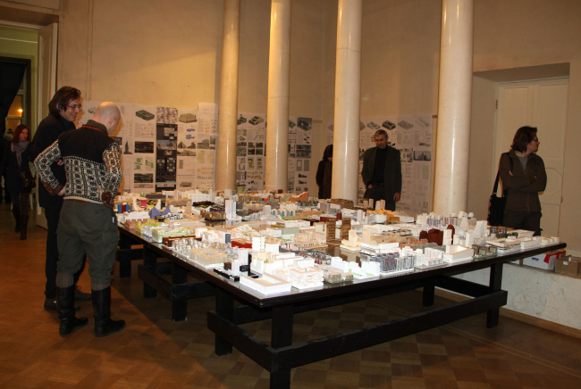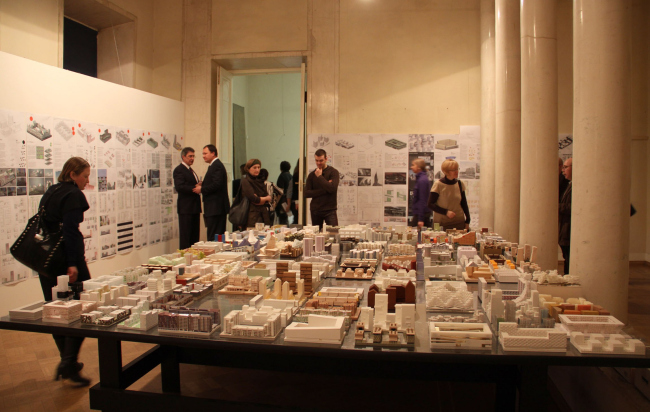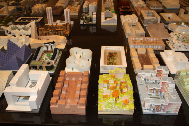 На выставке в Анфиладе Музея архитектуры результаты двух конкурсов демонстрируются параллельно. В пространстве залов размещены градостроительные концепции – с макетами, максимально подробными планшетами и предложениями по архитектуре отдельных кварталов, а противоположная стена занята работами участников открытого конкурса. Поскольку последних было очень много, то их проекты представлены на узких вертикальных полосах ватмана: стоя перед ними, можно прочитать краткую аннотацию и рассмотреть визуализации, присев на корточки – изучить чертежи. Для тех же, кто подробной информации предпочитает наглядность, в последнем зале на гигантском столе выставлены все макеты (за исключением нескольких несчастных, не переживших транспортировку). Совершенно разные по пластике, стилю и цвету, они образуют столь пестрый «Город кварталов», что, скорее, напоминают прилавок магазина игрушек, чем серьезную архитектурную экспозицию. Впрочем, организаторы именно к такому эффекту и стремились – показать, насколько разной может быть архитектура при едином заданном стандарте квартала.