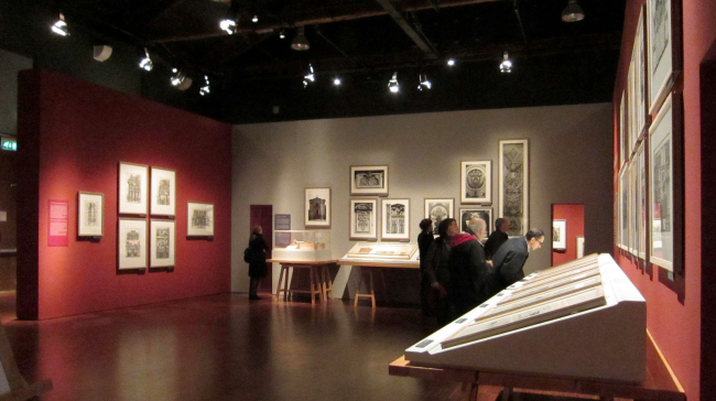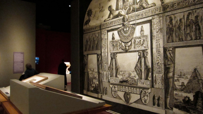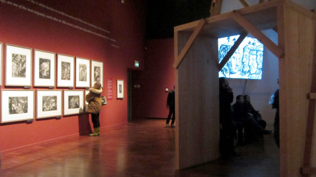 По-студенчески смело и свежо выглядит анимационный проект «Тюрьмы». Посреди зала с гравюрами стоит пятиметровая деревянная башня – шалаш, покрытая белой простынёй. Этот самостоятельный дизайнерский объект, навеянный графикой офорта, выполняет роль кинотеатра, где под музыку беспрерывно идёт трёхмерное путешествие в мир архитектурных фантазий. Сам фильм для специалиста тоже не вызовет удивления. В общем, это ученическая работа, сделанная в 3D MAX. Но всё в целом – удача. А главное достоинство этих проектов в том, что к традиционным выставочным стенам прибавились объёмные элементы, появилась возможность театрально использовать пространство, разнообразить экспозиционные акценты по траектории движения посетителей. Всё сделано профессионально и с большим вкусом. Вероятно, это самая лучшая выставка из посвящённых памяти великого Пиранези.