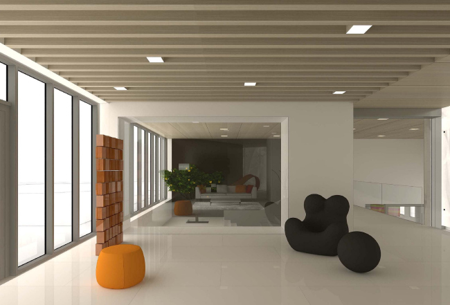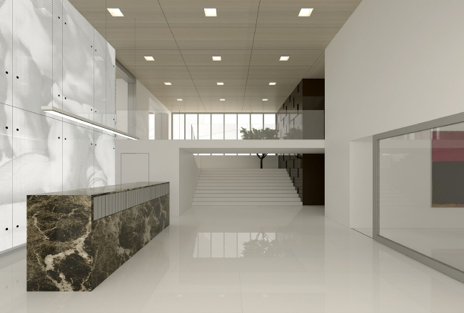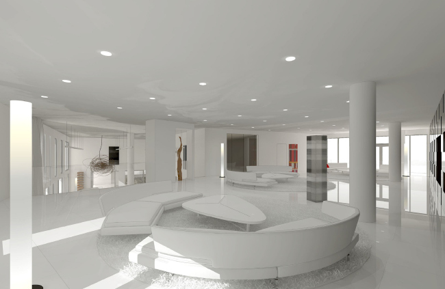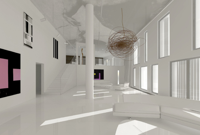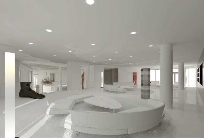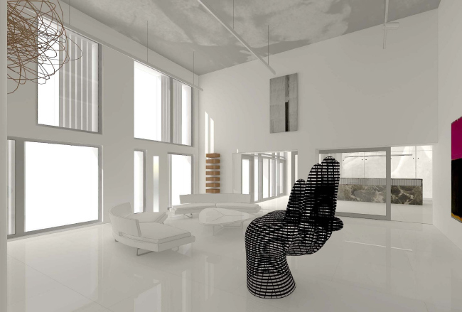 Похожими яркими «вставками» оживлен и интерьер художественной галереи, расположенной на первом этаже жилого комплекса. Она не имеет отдельного входа с улицы, а от зоны ресепшн отделена раздвижными стеклянными дверьми. Это стильное двусветное пространство предназначено, в первую очередь, для жильцов дома, которые могут проводить здесь выставки, презентации или просто неформальные встречи.