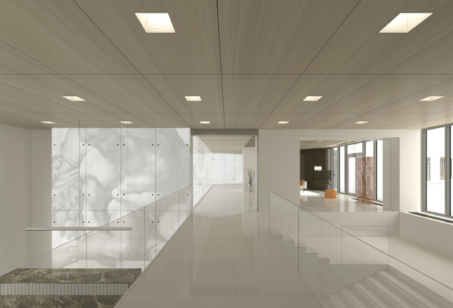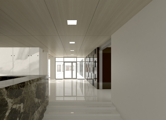 Напомним, . Новое здание сохраняет исконный масштаб улицы: следуя исторической парцелляции, объем визуально разделен на три части. Разные оттенки камня и индивидуальный рисунок окон каждой из частей дома насыщают его фасады такой богатой пластикой и фактурой, что интерьеры общественных зон архитекторам хотелось сделать совсем другими. «Чистыми и свободными от сложной тематики и избыточной материальности фасадов, – поясняет главный архитектор проекта Алексей Медведев. – Единственная «внешняя» тема, казавшаяся нам уместной в данном интерьере, это светлое дерево, которым отделан дворовый фасад, но позже и от этой идеи отказались, отдав предпочтение белому цвету».