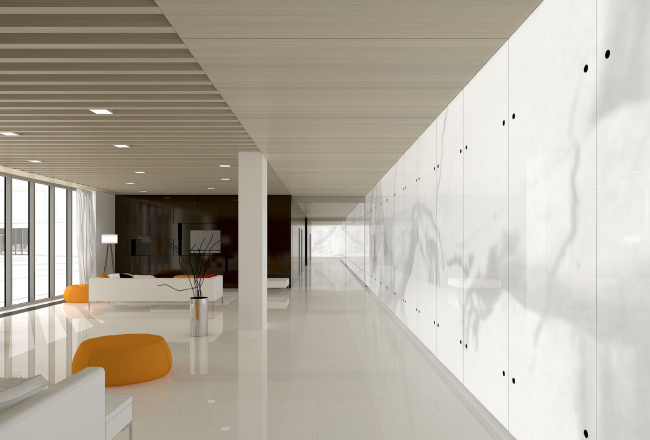 Белый цвет здесь действительно доминирует: белые стены и потолки, белые полы из крупноразмерных плит агломерата. Благодаря цветовому единству плоскости визуально свободно перетекают друг в друга. Более цельным и воздушным пространство становится благодаря большому количеству стекла — перегородки, ограждения лестниц, декоративное панно с подсветкой.