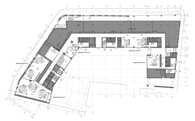 Лифтовые блоки отделаны корианом темно-шоколадного цвета и хорошо заметны в общей структуре входной зоны. В их оформлении есть одна любопытная тонкость: плоскости, параллельные световому фронту, имеют ровную глянцевую поверхность, а те, что перпендикулярны окнам, – наоборот, сложную многомерную структуру. Так, к зонам отдыха обращены книжные стеллажи и ниши для телевизоров, а к выходу в переулок – объемная композиция а-ля пазл. В обстановке рекреаций, задуманных как некие общественные комнаты для детей и взрослых, доминирует мебель белого цвета, однако здесь белоснежные поверхности «разбавлены» яркими цветовыми акцентами – оранжевыми пуфами и алыми подушками.